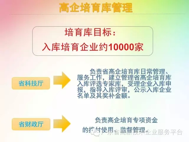 广东省科(kē)技厅、广东省财政厅结合今年国家修订的(de)高(gāo)企认定管理(lǐ)办法和高(gāo)企认定工作指引,新(xīn)修订并发布了《广东省高(gāo)新(xīn)技术企业培育工作实施细则》。依据该《实施细则》,省科(kē)技厅、省财政厅负责统筹全省高(gāo)企培育工作,负责省高(gāo)企培育库和省高(gāo)企培育专项資(zī)金的(de)管理(lǐ),指导各地(dì)市(shì)高(gāo)企培育机构建设和强化(huà)(huà)高(gāo)企培育管理(lǐ)服(fú)務(wù)。
