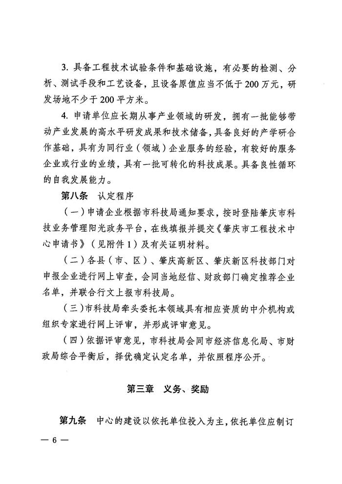 根据我(wǒ)市(shì)实施创新(xīn)驱动发展战略和省市(shì)对创新(xīn)平台建设工作要求,依据《肇庆市(shì)加快民营经济发展实施意见》(肇办字[2017]12号)、《肇庆市(shì)工程技术中心认定管理(lǐ)办法》(肇科(kē)〔2017〕53号)等文件(jiàn)精神,现组织开展2018年度肇庆市(shì)工程技术中心认定工作,請(qǐng)各有关单位对照(zhào)管理(lǐ)办法的(de)相关规定进行(xíng)申報(bào),具体事项通知如下: