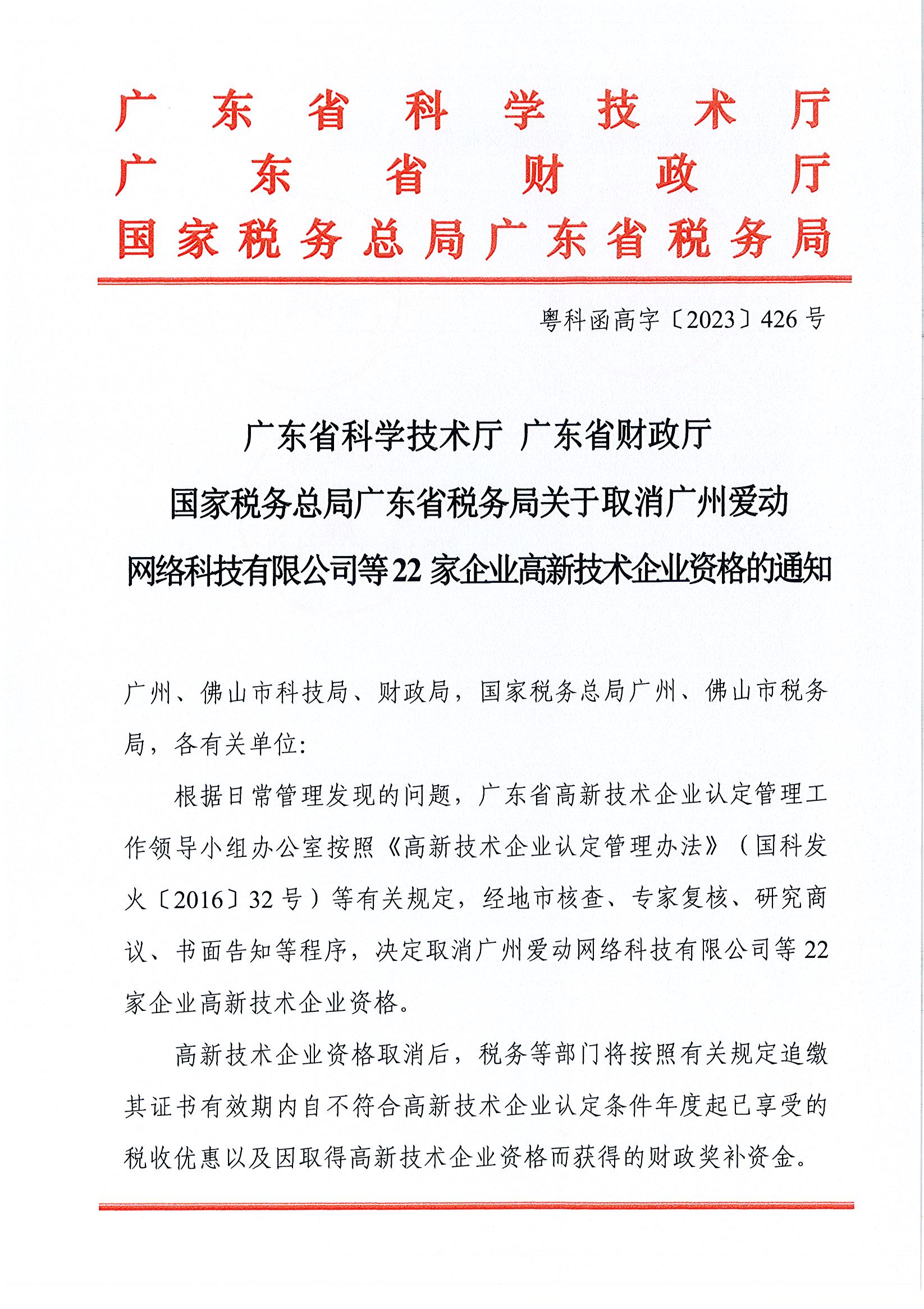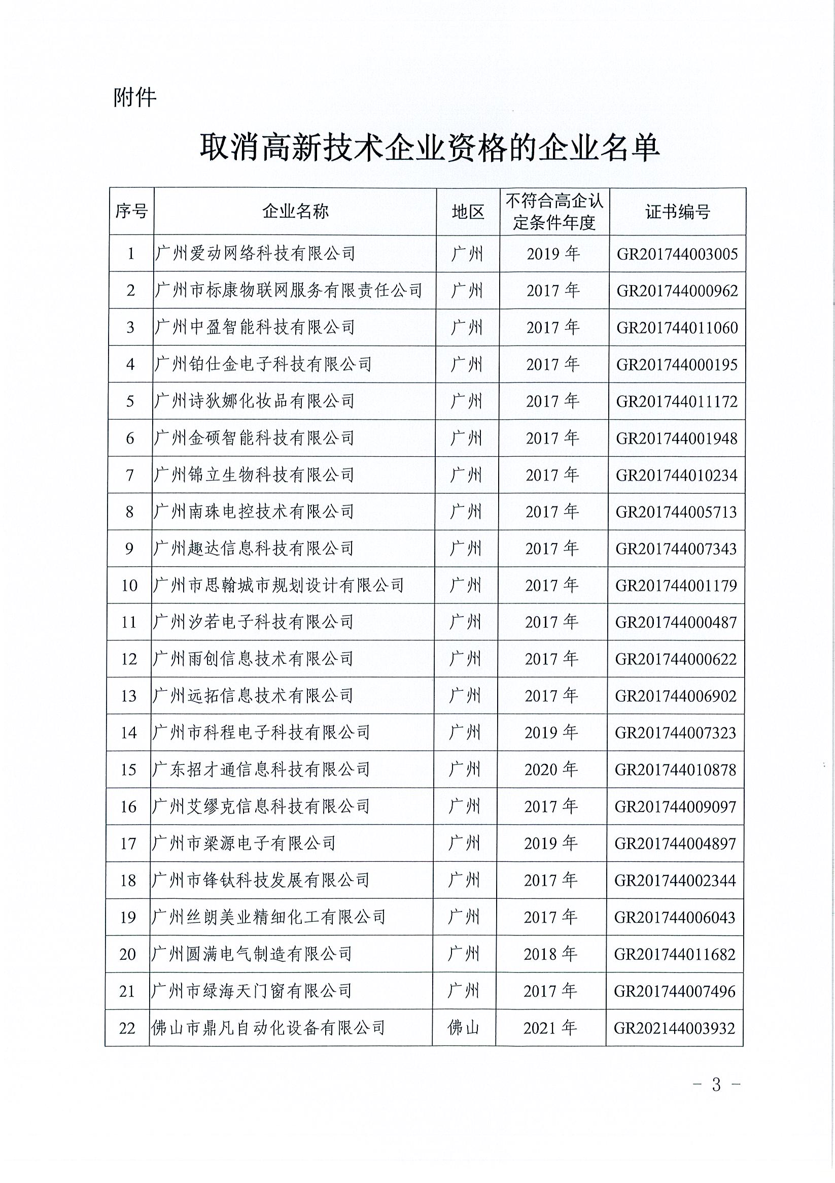 广东省认定机构:关于取消广州爱动网络科(kē)技有限公司(sī)等22家企业高(gāo)新(xīn)技术企业資(zī)格的(de)通知.pdf