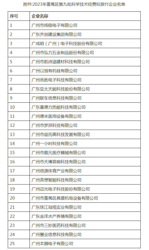 附件(jiàn):2023年番禺區(qū)第九批科(kē)學(xué)技术经费拟拨付企业名单