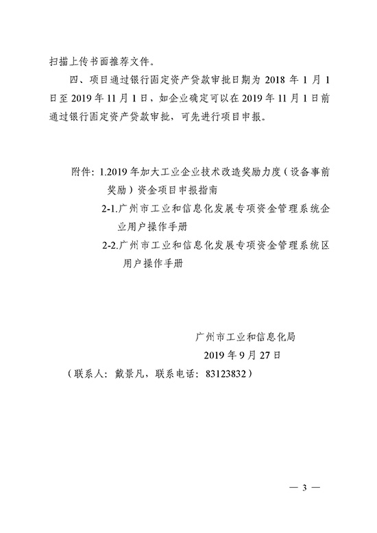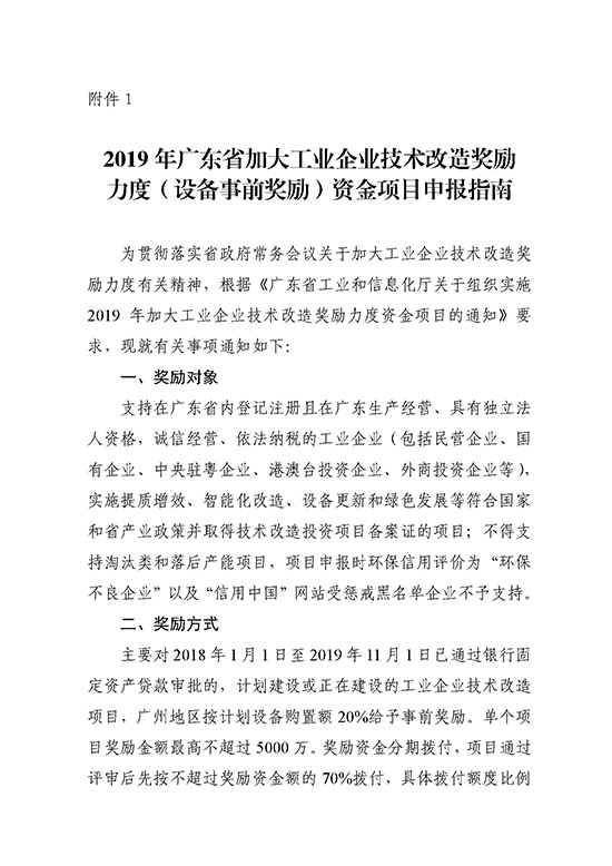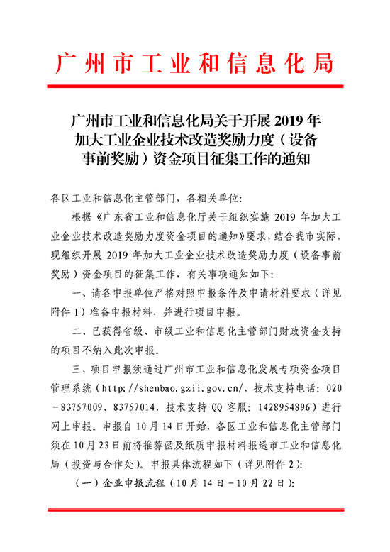 广州市(shì)工业和信息化(huà)(huà)局关于开展2019年加大工业企业技术改造奖励力度(设备事前奖励)資(zī)金项目征集工作的(de)通知