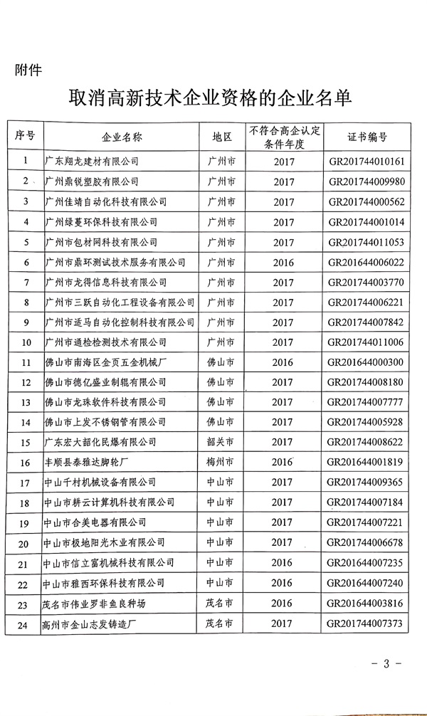 关于取消广东翔龙建材有限公司(sī)24家企业高(gāo)新(xīn)技术企业資(zī)格的(de)通知