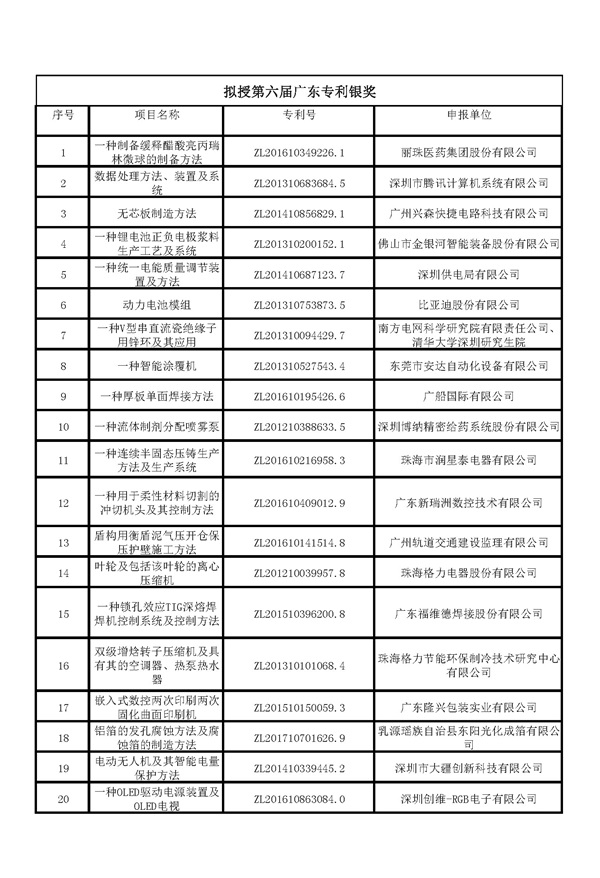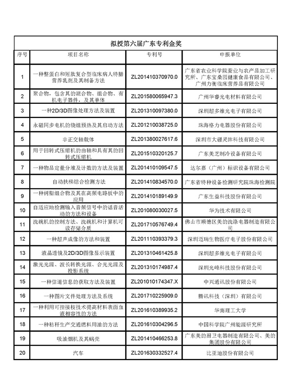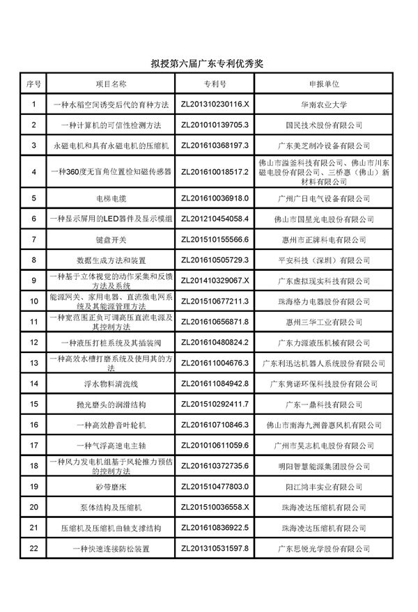 按照(zhào)《广东省专利奖励办法》(广东省人民政府令258号),第六届广东专利奖共评选出广东专利金奖20项、广东专利銀(yín)奖40项、广东专利优秀奖60项、广东杰出发明人奖10项,现予以公示,公示期為(wèi)2019年11月14日至11月29日。有异議(yì)者請(qǐng)于公示期间以書(shū)面形式向广东专利奖评审委员會(huì)办公室提出,提出异議(yì)应当签署真实姓名或者加盖单位公章,并注明联系方式,否则不(bù)予受理(lǐ)。