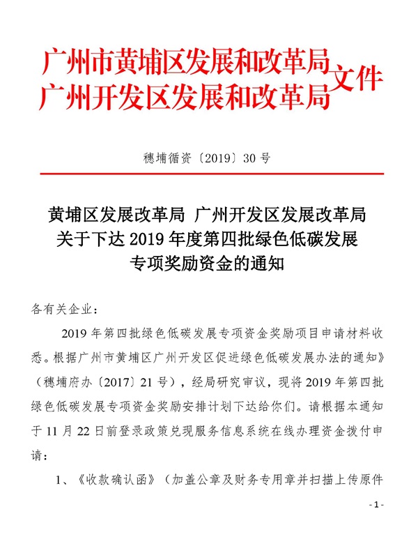 黄埔區(qū)发展改革局广州开发區(qū)发展改革局关于下达2019年度第四批绿色低碳发展专项奖励資(zī)金的(de)通知
