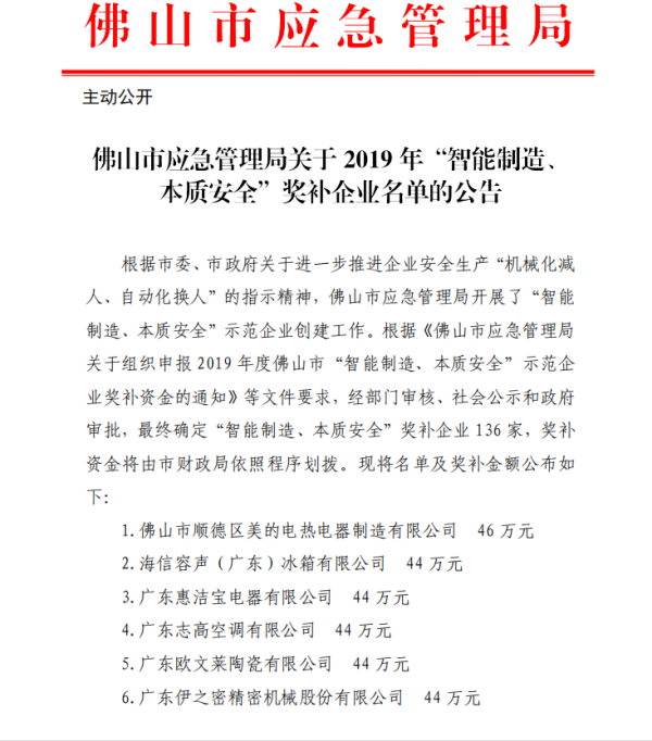 佛山市(shì)应急管理(lǐ)局关于2019年“智能制造、本质安全”奖补企业名单的(de)公告