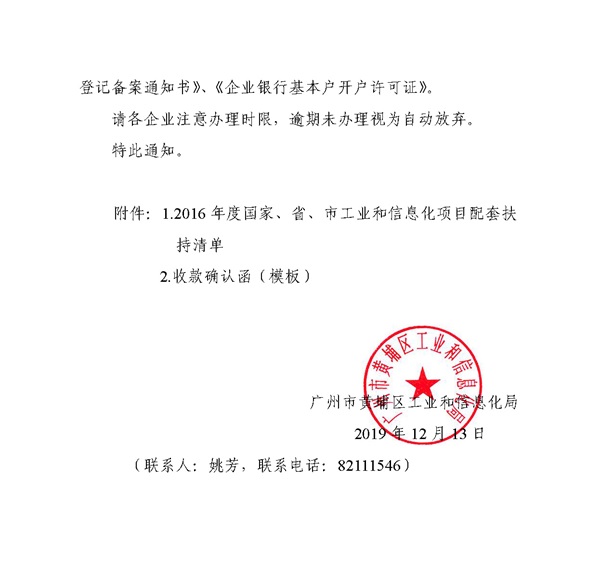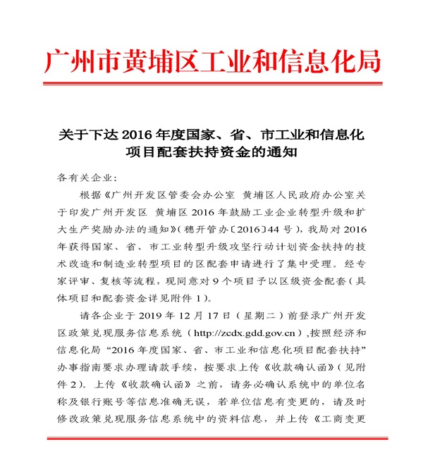 黄埔區(qū)关于下达2016年度国家、省、市(shì)工业和信息化(huà)(huà)项目配套扶持資(zī)金的(de)通知